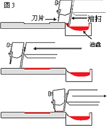 在這個(gè)設(shè)計(jì)中,油墨是放于鋼板后的油盤(pán)里(3)。印刷時(shí),油墨會(huì)被油掃刮到鋼板上。這時(shí)候,油盤(pán)會(huì)被這個(gè)橫移的組件遮蓋,減少溶劑揮發(fā)。油盤(pán)實(shí)際上沒(méi)有完全被覆蓋,但卻能阻止溶劑揮發(fā)。比較開(kāi)放式油盤(pán),油墨濃度更穩(wěn)定,作用亦更持久。