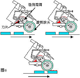 滾印技術(shù)是源于凹版印刷,兩者均普遍使用于圓柱表面或連續(xù)印刷平面物件。這種機(jī)型采用滾動(dòng)式的矽膠頭和滾筒式鋼板,油墨會(huì)從油盤(pán)或經(jīng)管道覆蓋圖案,然后刀片再把多余的油墨刮去。當(dāng)滾筒旋轉(zhuǎn)時(shí),膠頭就能從鋼板上取得圖案,然后移到物件上。(圖6)