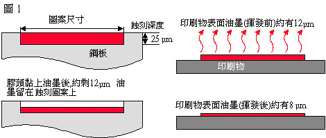 移印油墨與絲印油墨相似,但絲印油墨不會快速揮發(fā),否則油墨就會在網(wǎng)框里乾透。反之,移印油墨則需要有高度揮發(fā)的功能,令油墨能輕易黏上及離開膠頭。另外,移印油墨比起絲印的會較薄。(圖1) |